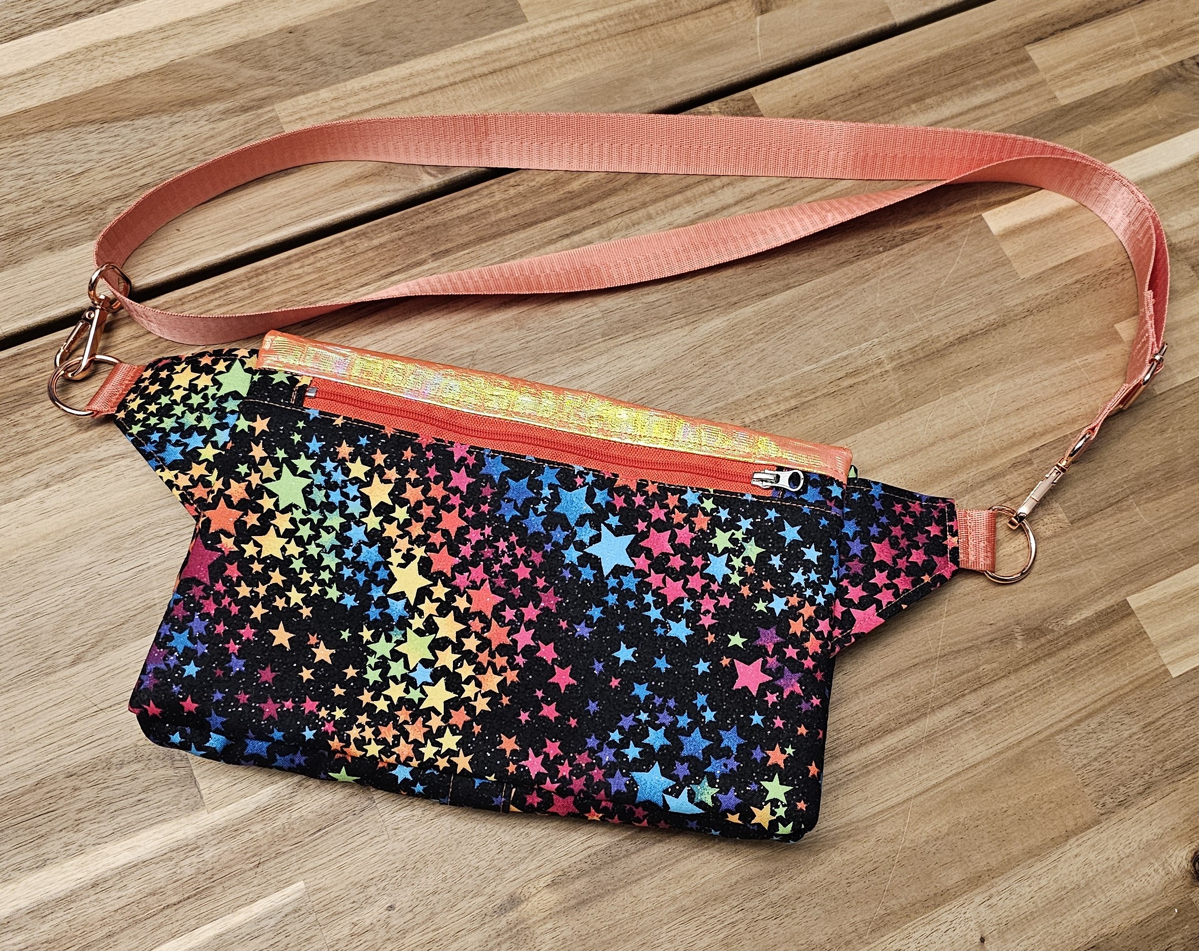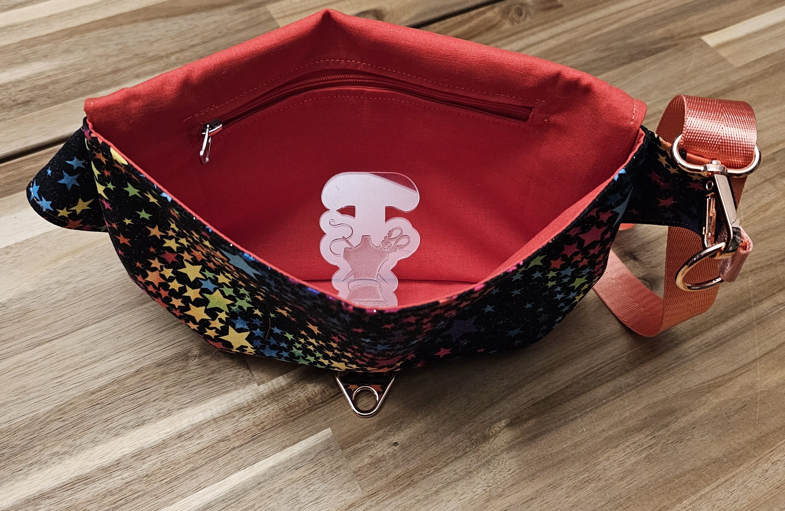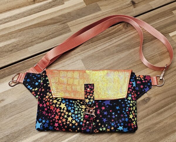 A Haralson crossbody style bag with Glittery Rainbow Stars and Rose Gold hardware. A nice day to day lightweight purse.