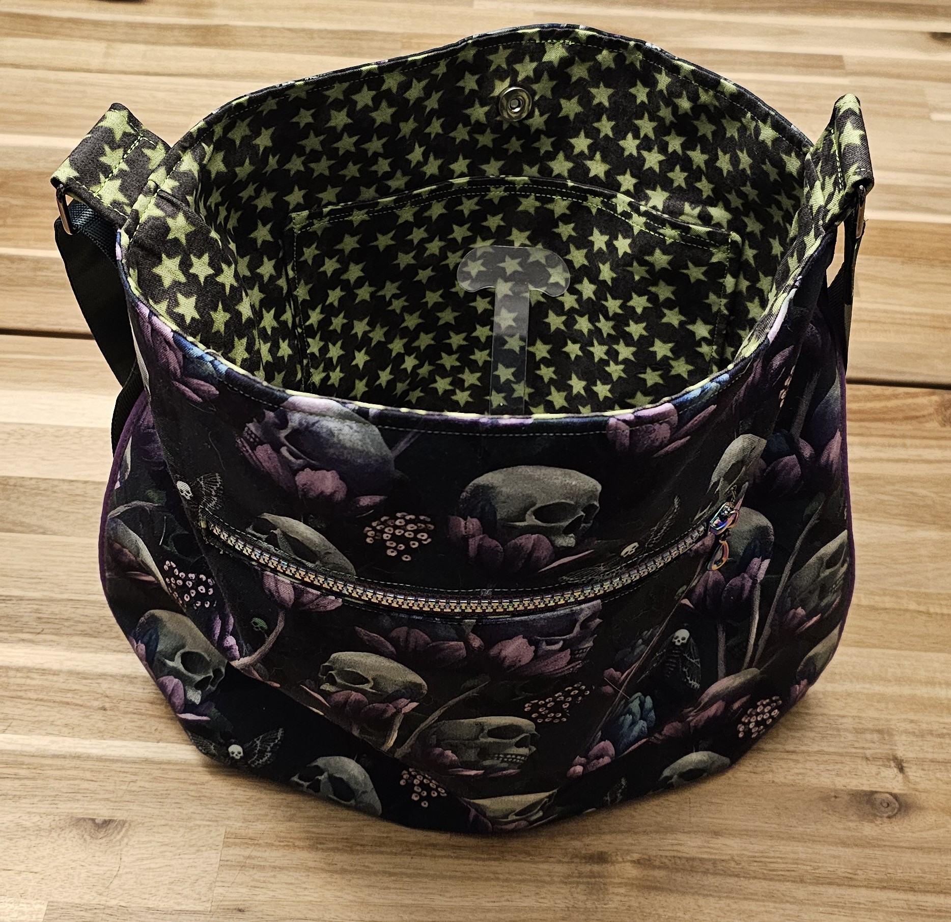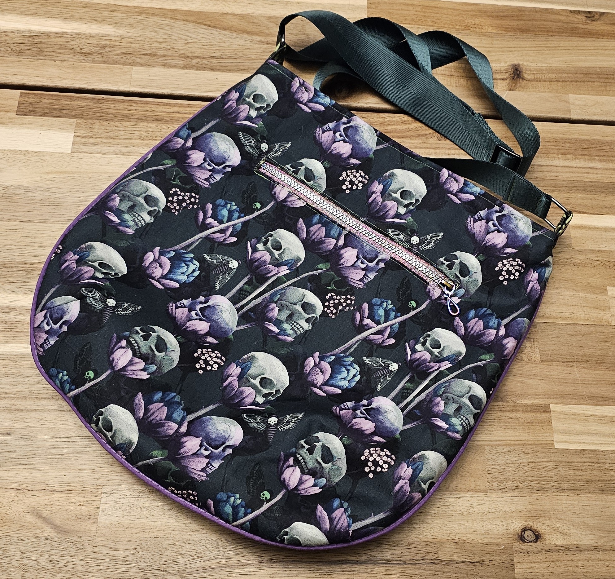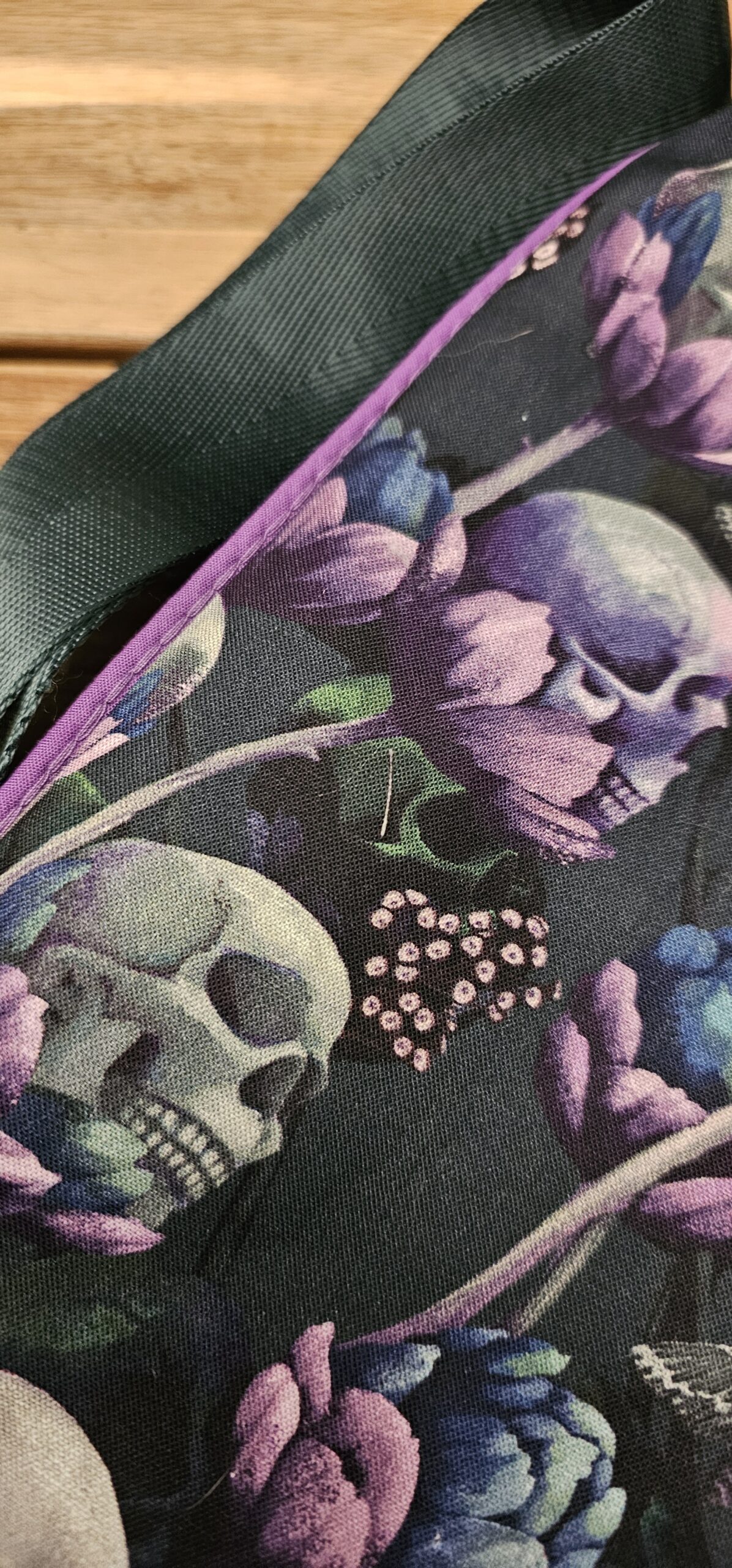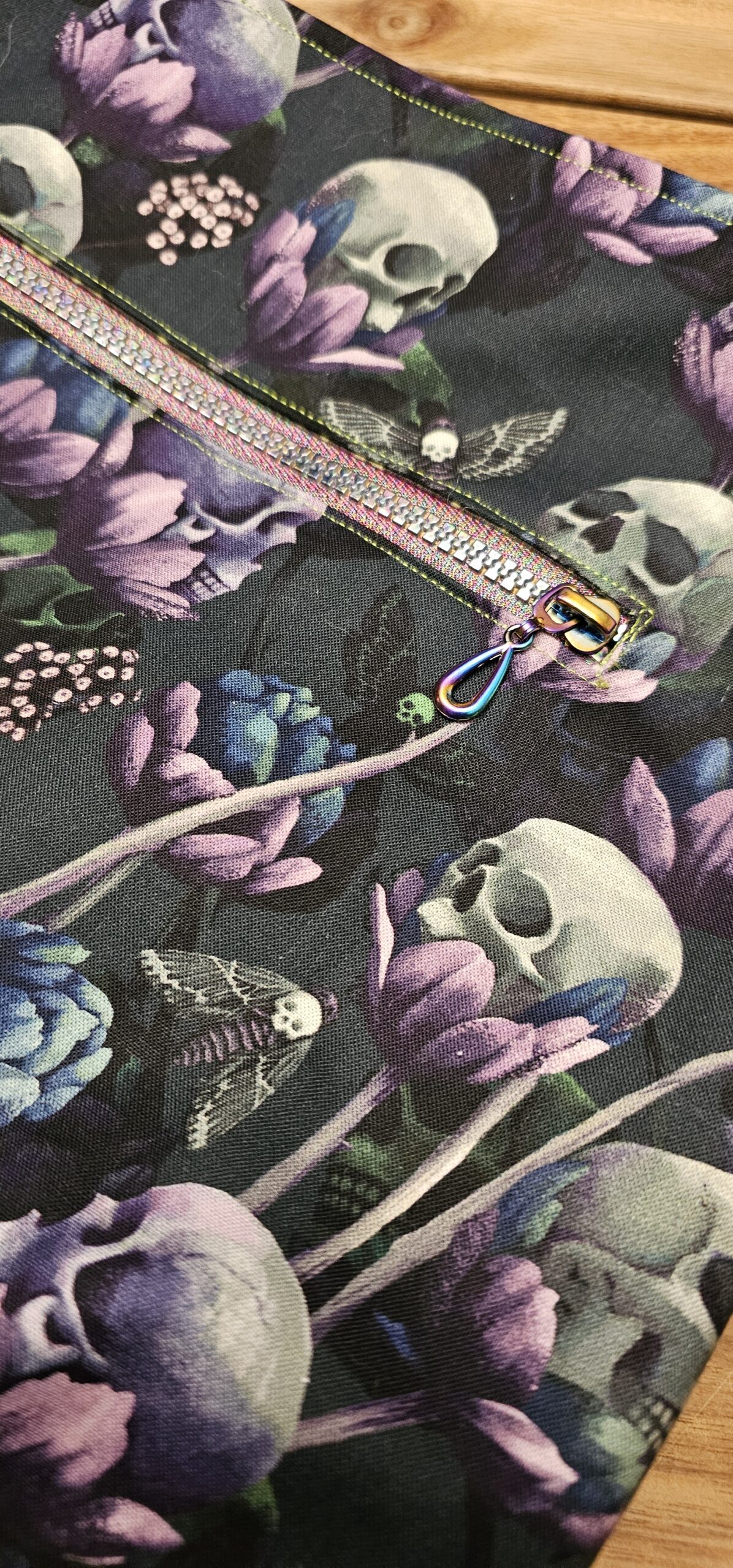 A Trail Tote style bag with spooky skulls and flowers.  A nice bag for carrying notebook-sized items.